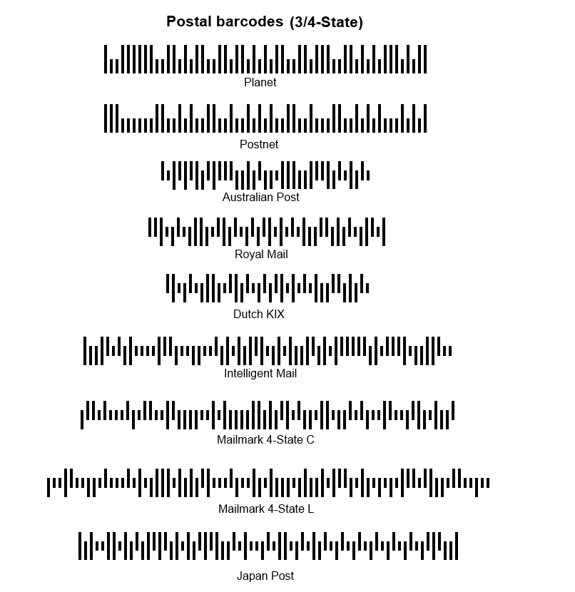 Это особый класс штрих-кодов, где каждый штрих имеет одно из четырёх состояний по высоте и положению относительно базовой линии. Штрих-коды из этого множества штрих-кодов используются крупными почтовыми операторами США, Великобритании, Австралии, Японии и других стран. Такие штрих-коды обычно содержат идентификатор отправителя, тип услуги, уникальный номер отправления и маршрутную информацию, оставаясь при этом довольно компактными.