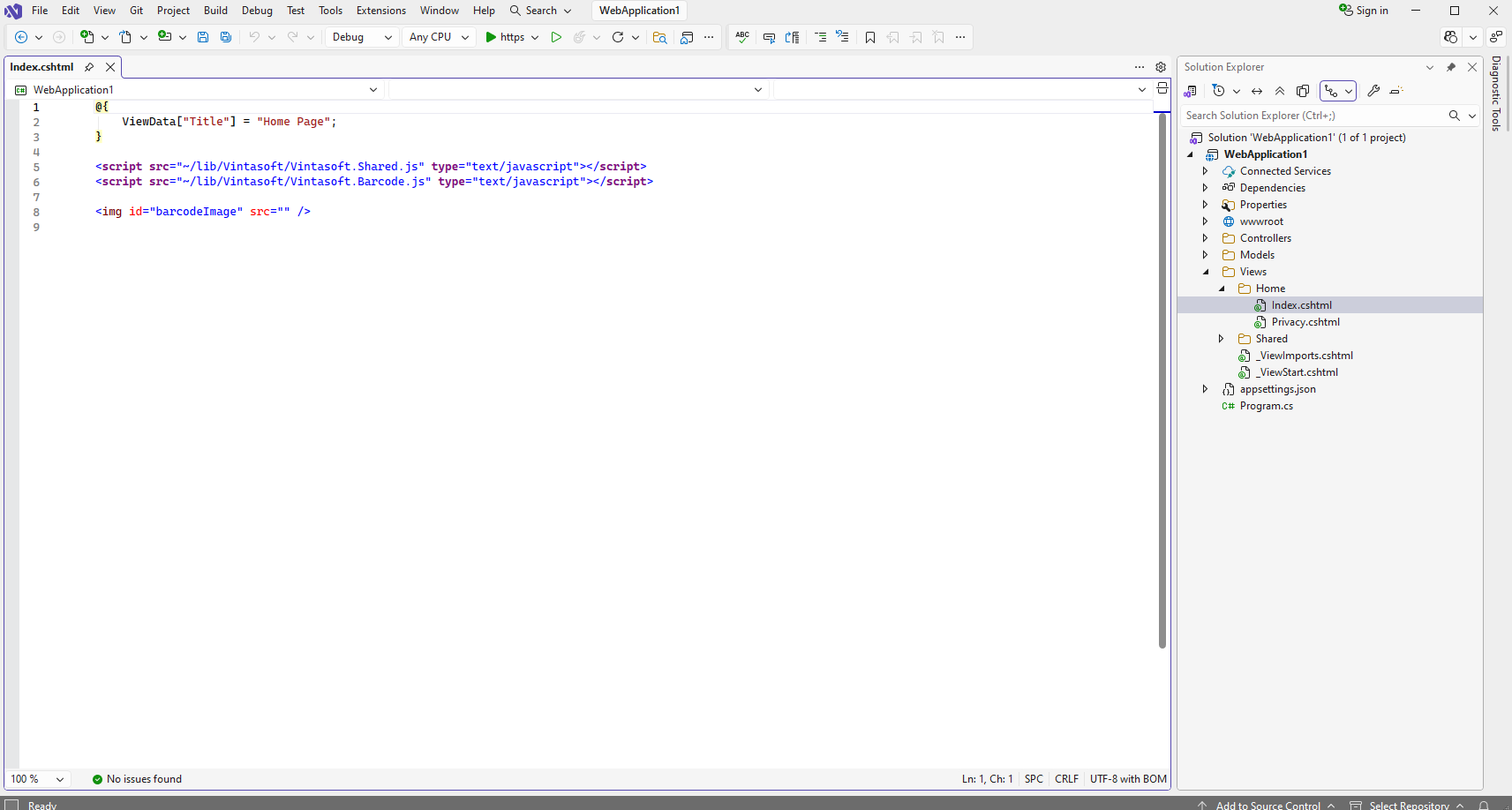 Откройте файл "Views\Home\Index.cshtml", очистите файл, добавьте HTML-код (ссылки на файлы JavaScript VintaSoft; IMG-элемент, который будет отображать сгенерированное изображение штрих-кода) в файл "Index.cshtml":