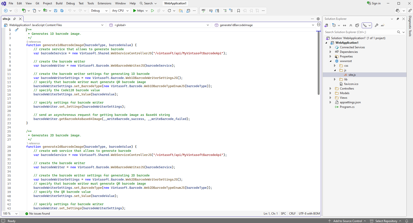 Откройте файл "wwwroot\js\site.js", очистите файл, добавьте код JavaScript (генерирует изображение штрих-кода и отображает сгенерированное изображение штрих-кода) в файл "site.js":