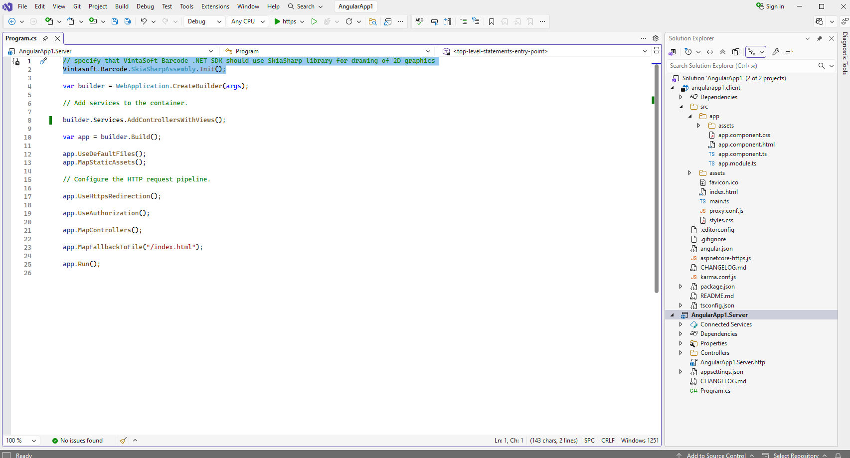 Откройте файл "Program.cs" и добавьте строку кода "Vintasoft.Barcode.SkiaSharpAssembly.Init();" в начало файла: