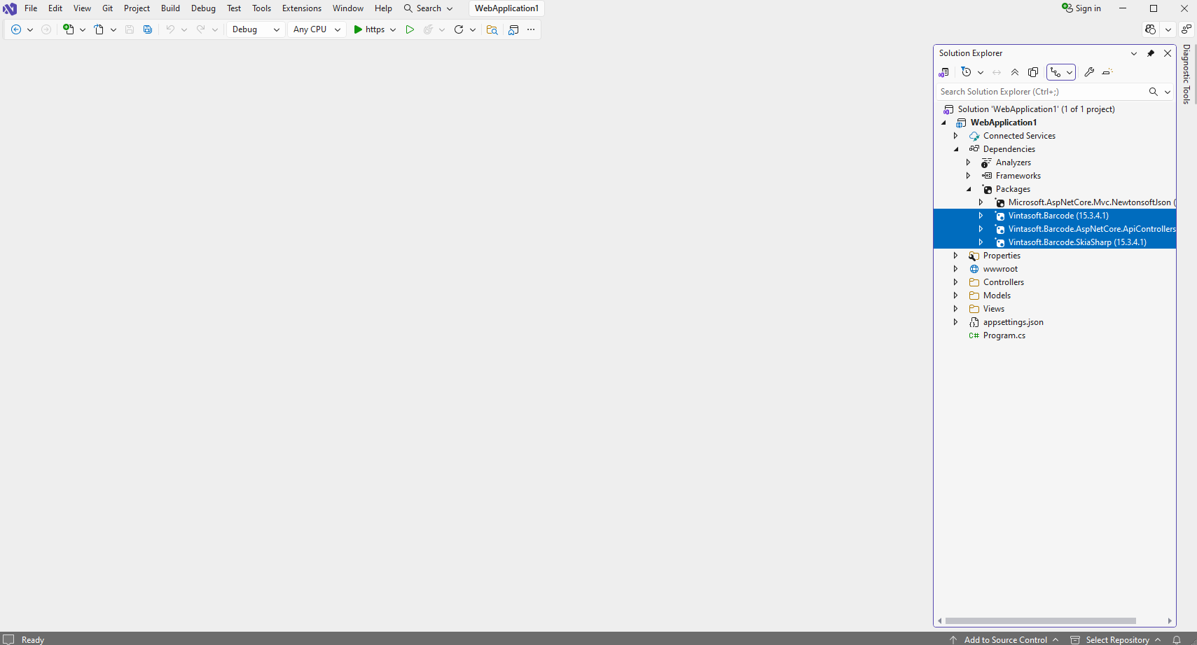 Добавьте ссылки на nuget-пакеты "Vintasoft.Barcode", "Vintasoft.Barcode.SkiaSharp" и "Vintasoft.Barcode.AspNetCore.ApiControllers" в проект ASP.NET Core.