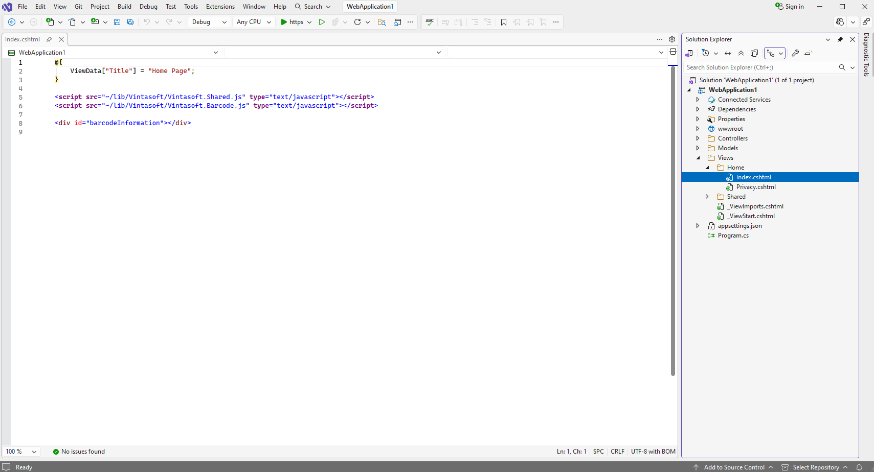 Откройте файл "Views\Home\Index.cshtml", очистите файл, добавьте HTML-код (ссылки на файлы JavaScript VintaSoft; DIV-элемент, который будет отображать информацию о распознанных штрих-кодах) в файл "Index.cshtml":