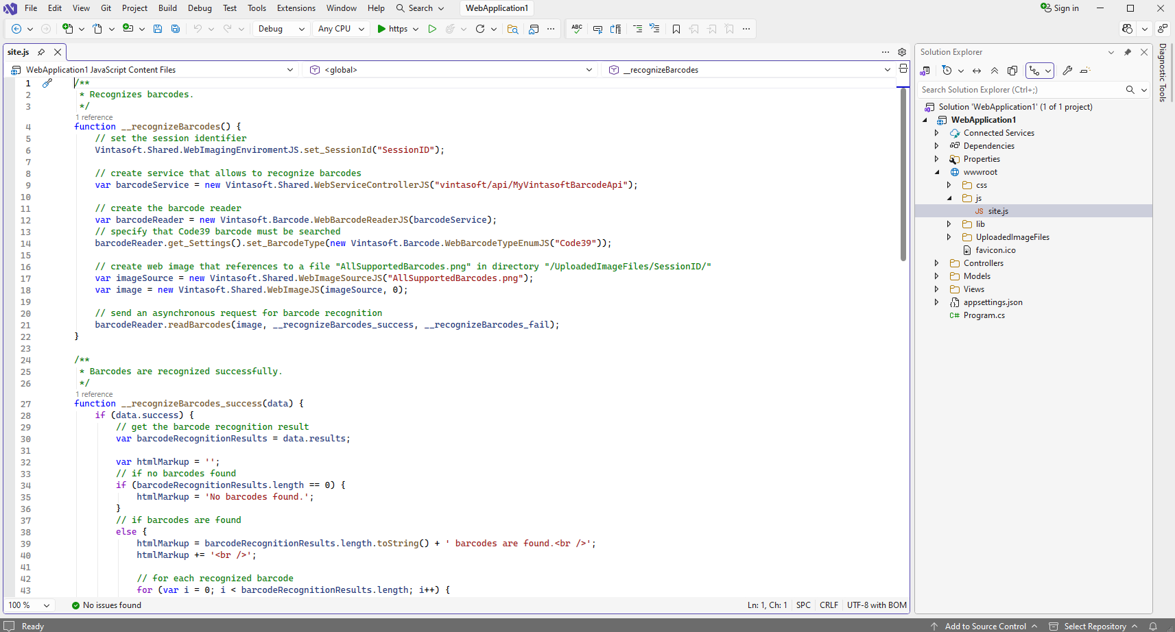 Откройте файл "wwwroot\js\site.js", очистите файл, добавьте JavaScript-код (распознает штрих-коды в изображении и отобразит результат распознавания штрих-кодов) в файл "site.js":