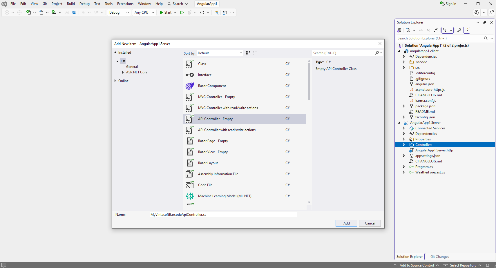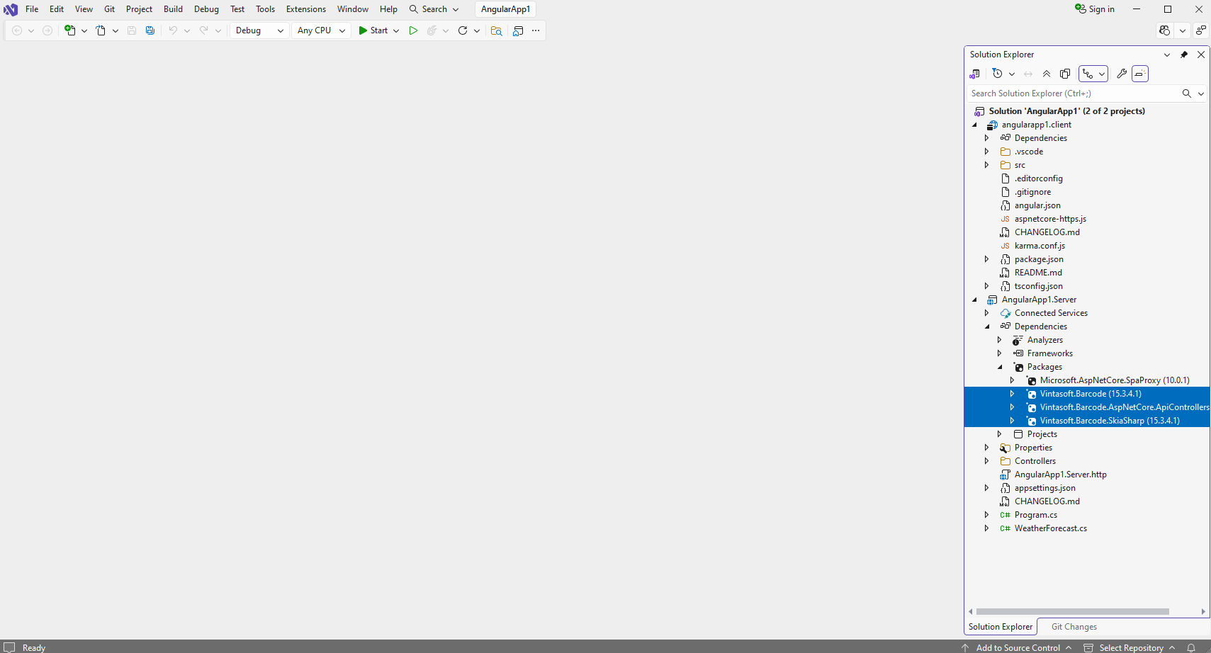 Добавьте ссылки на nuget-пакеты "Vintasoft.Barcode", "Vintasoft.Barcode.SkiaSharp" и "Vintasoft.Barcode.AspNetCore.ApiControllers" в проект "AngularApp1.Server".
