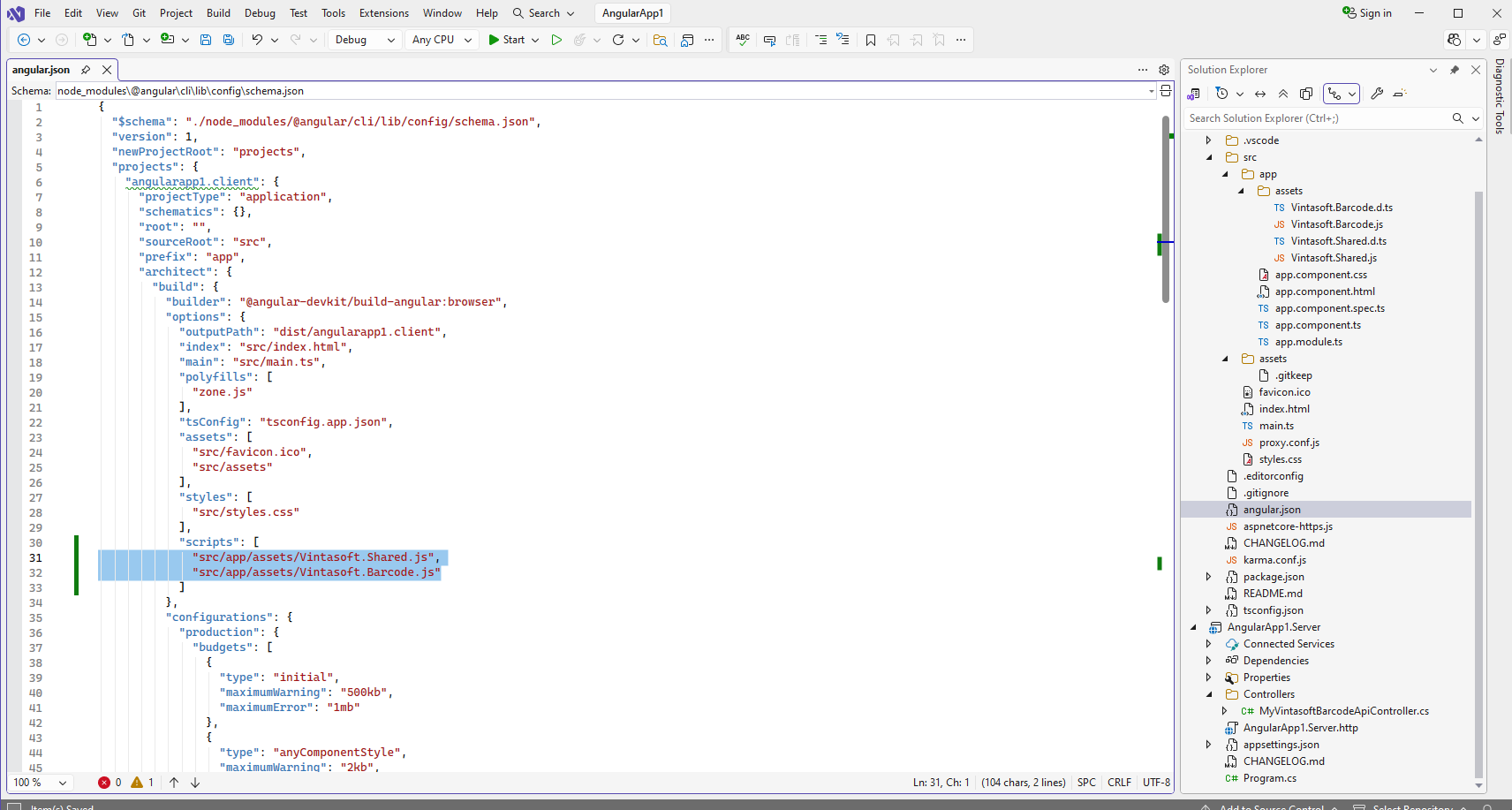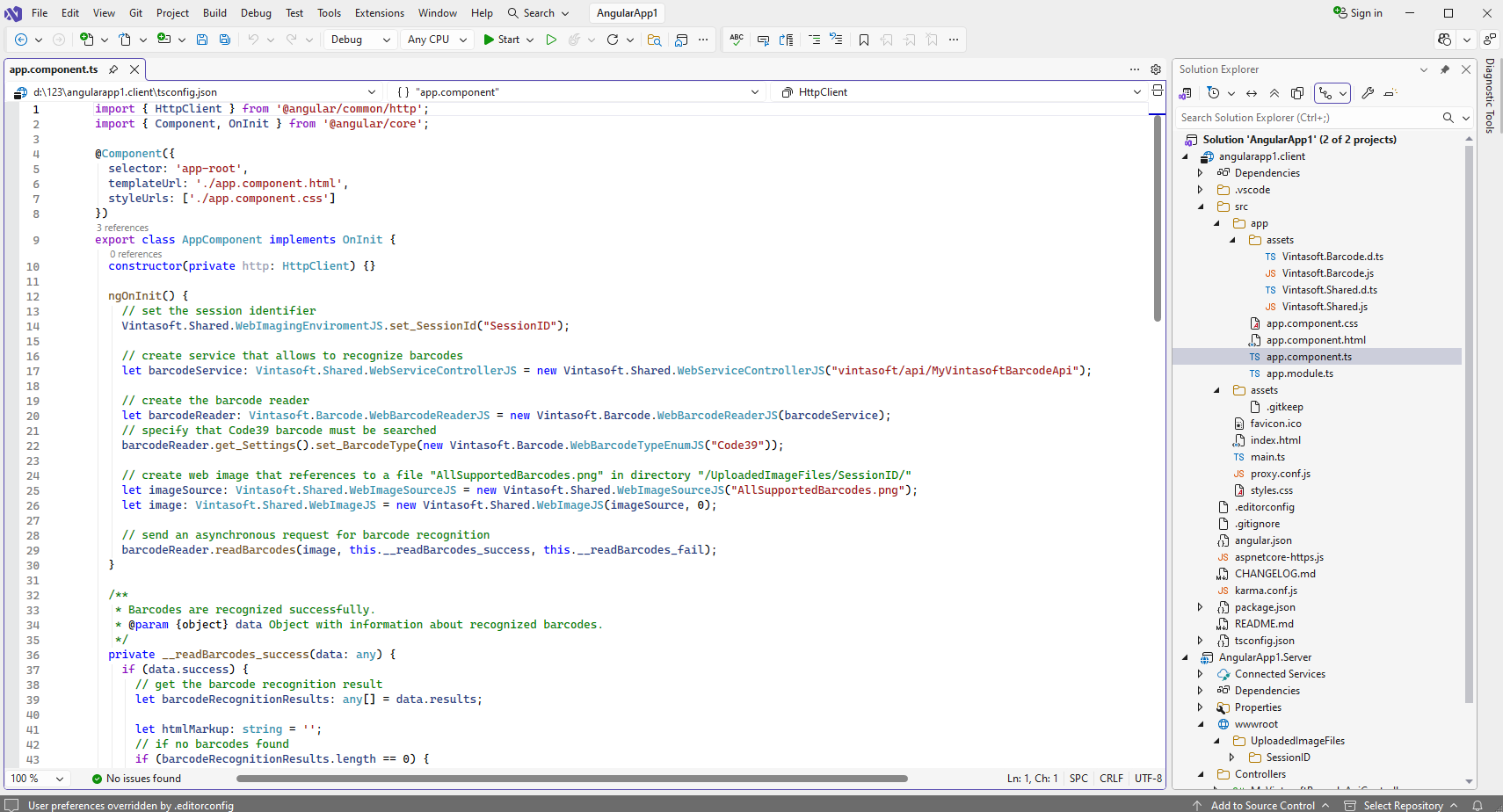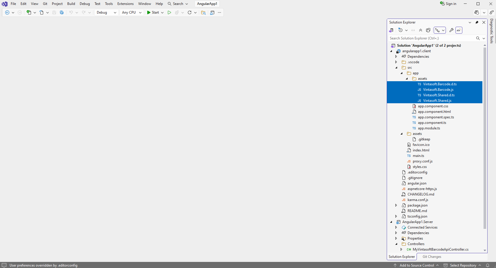 Скопируйте файлы Vintasoft.Shared.js, Vintasoft.Shared.d.ts, Vintasoft.Barcode.js и Vintasoft.Barcode.d.ts из папки "<InstallPath>\VintaSoft Barcode .NET 15.3\Bin\JavaScript\ в папку "src\app\assets\" в проекте "angularapp1.client".