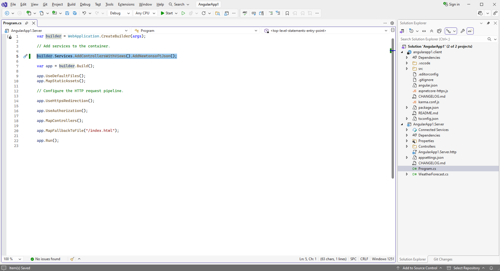 Добавьте ссылку на nuget-пакет "Microsoft.AspNetCore.Mvc.NewtonsoftJson" в проект "AngularApp1.Server":