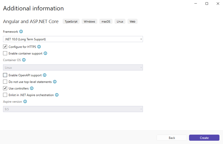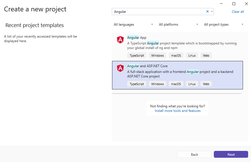 Откройте Visual Studio .NET 2026 и создайте новый проект приложения типа "Angular and ASP.NET Core":