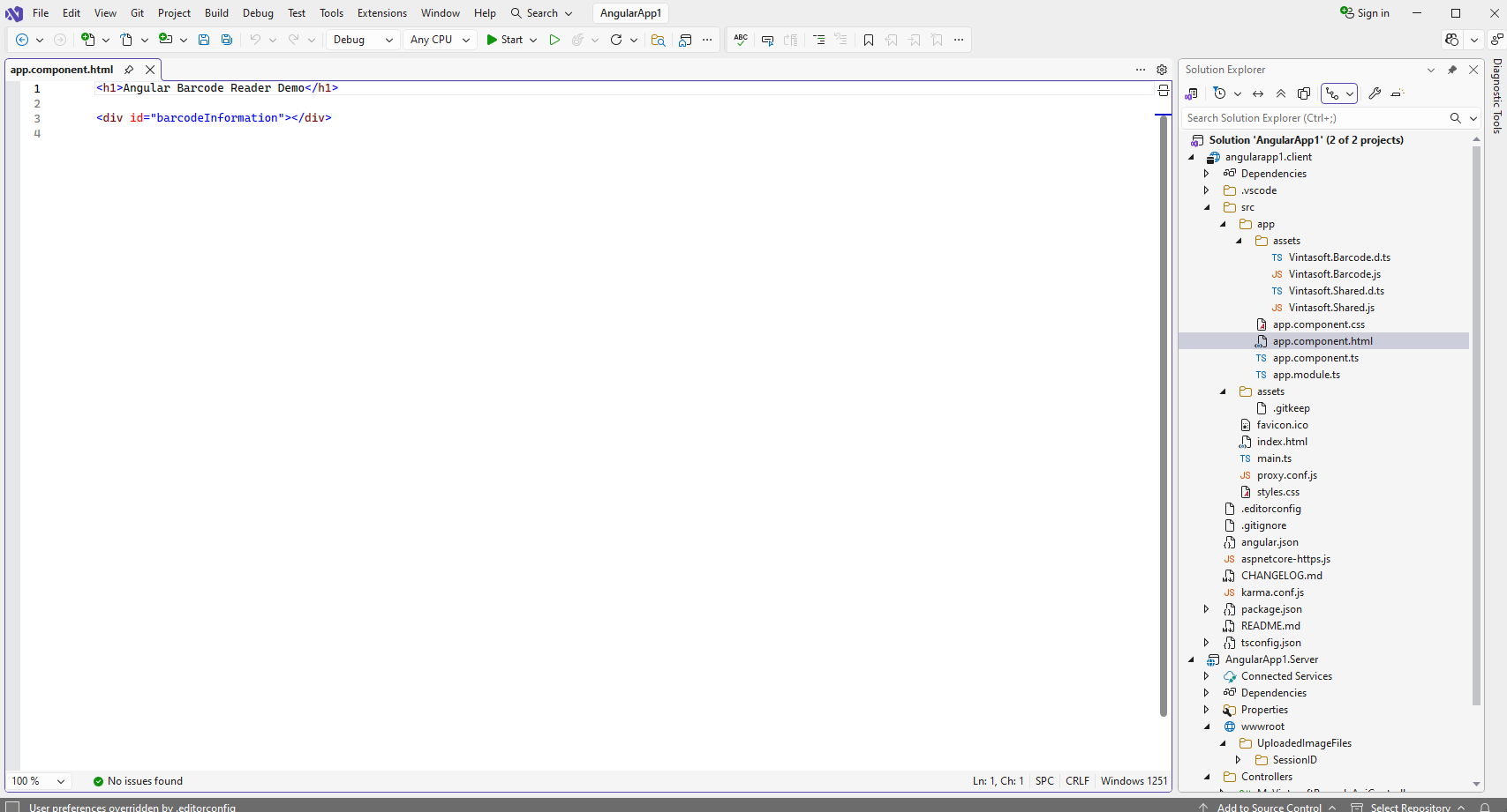 Откройте файл "src\app\app.component.html" в проекте "angularapp1.client", очистите файл, добавьте HTML-разметку (заголовок страницы и элемент изображения, который будет отображать результат распознавания штрих-кодов) в файл "app.component.html":