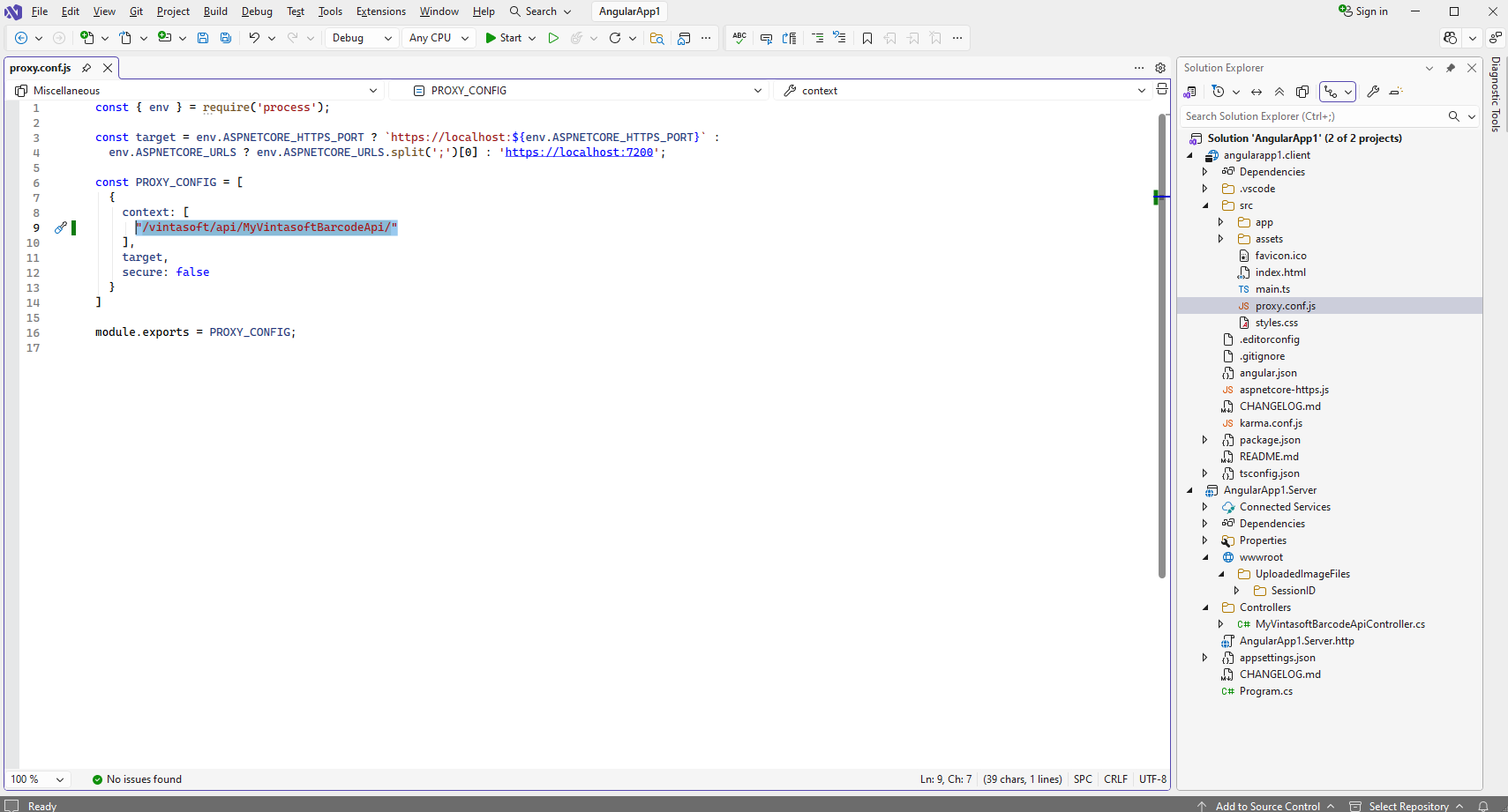 Откройте файл "src\proxy.conf.js" в проекте "angularapp1.client" и укажите, что приложение Angular может получить доступ к контроллеру ASP.NET Core Web API "/vintasoft/api/MyVintasoftBarcodeApi/" в проекте "AngularApp1.Server":