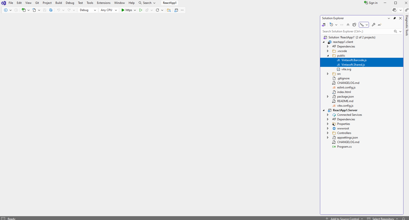 Скопируйте файлы Vintasoft.Shared.js и Vintasoft.Barcode.js из папки "\VintaSoft Barcode .NET 15.3\Bin\JavaScript\" в папку "public" в проекте "reactapp1.client".