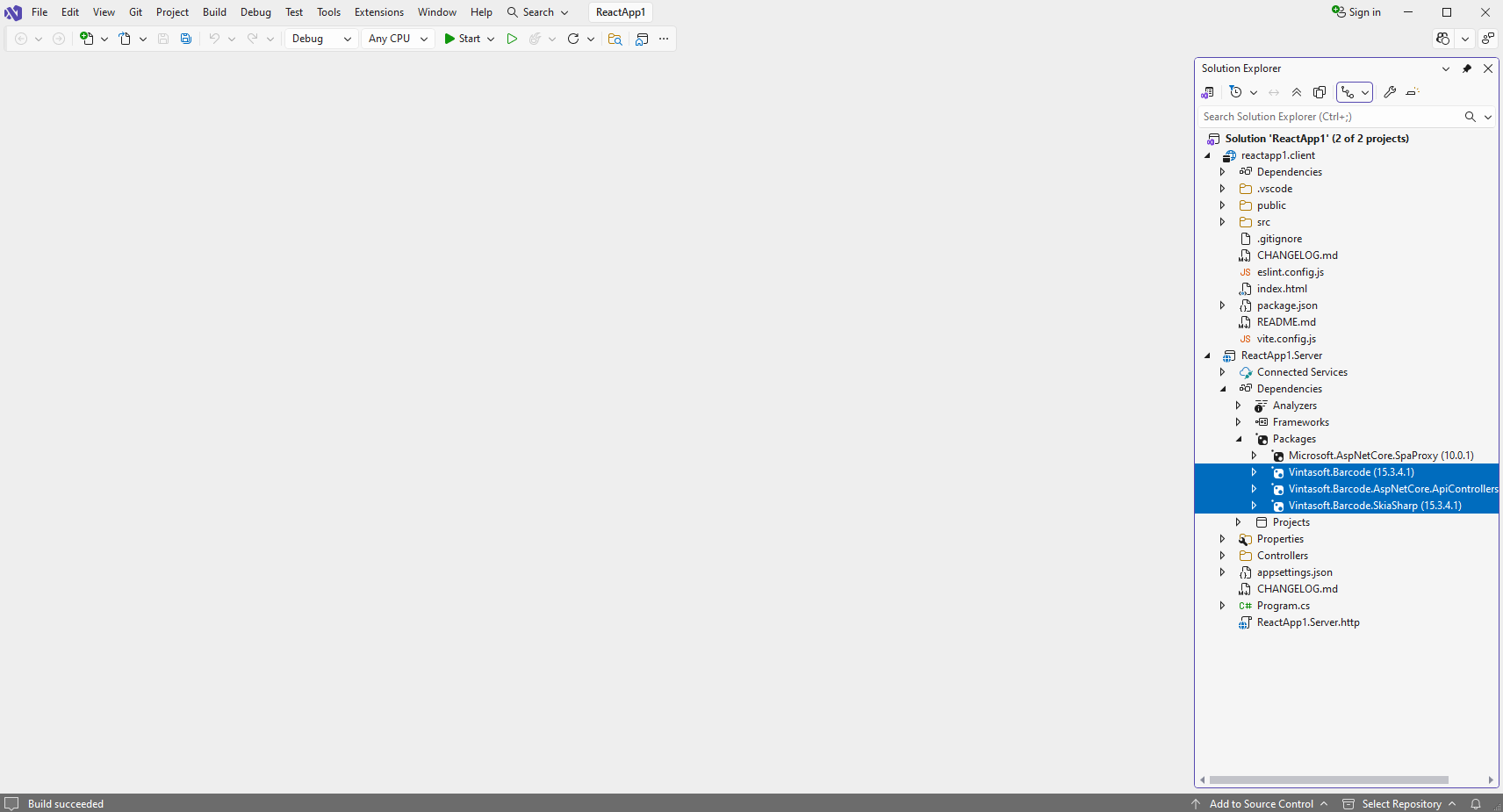 Добавьте ссылки на nuget-пакеты "Vintasoft.Barcode", "Vintasoft.Barcode.SkiaSharp" и "Vintasoft.Barcode.AspNetCore.ApiControllers" в проект "ReactApp1.Server".
