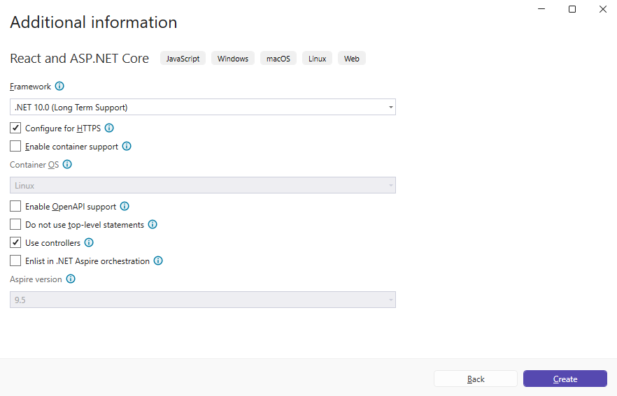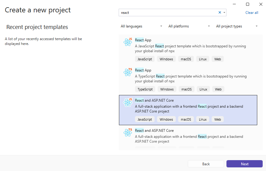Откройте Visual Studio .NET 2026 и создайте новый проект типа "приложение React.js и ASP.NET Core":