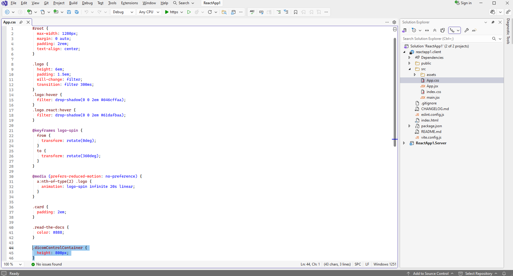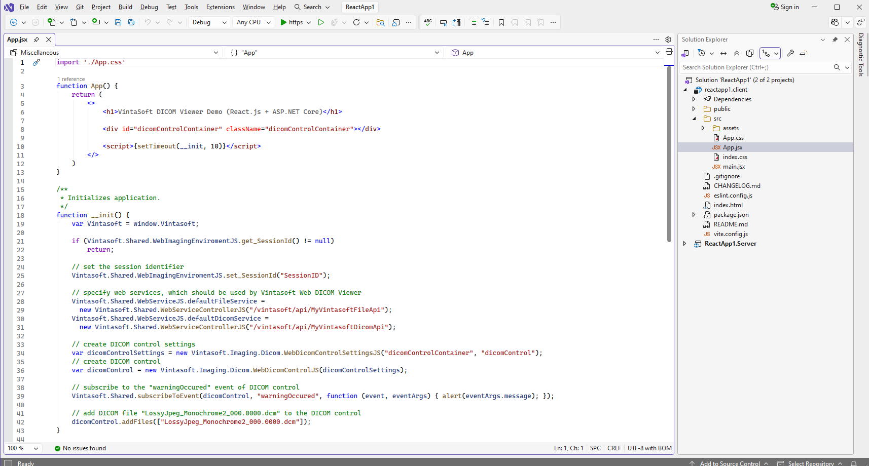 Откройте файл "src\App.jsx" в проекте "reactapp1.client", очистите файл, код функций "App" и "__init". Функция "App" возвращает HTML-разметку (заголовок страницы и DIV-элемент для DICOM просмотрщика). Функция "__init" инициализирует приложение и создает веб DICOM-просмотрщик.