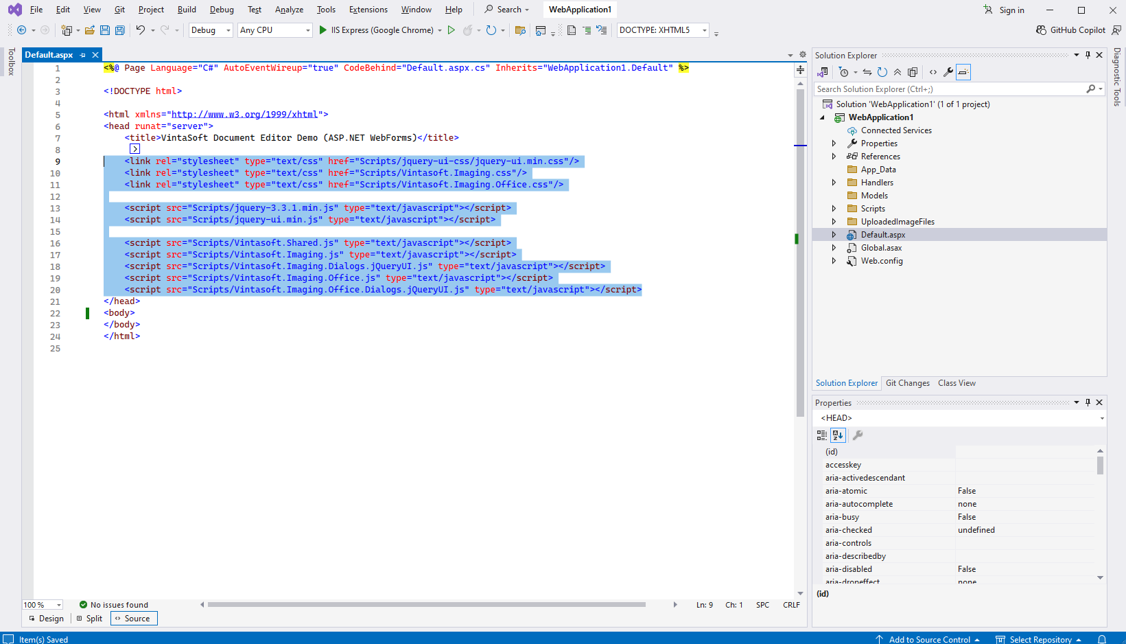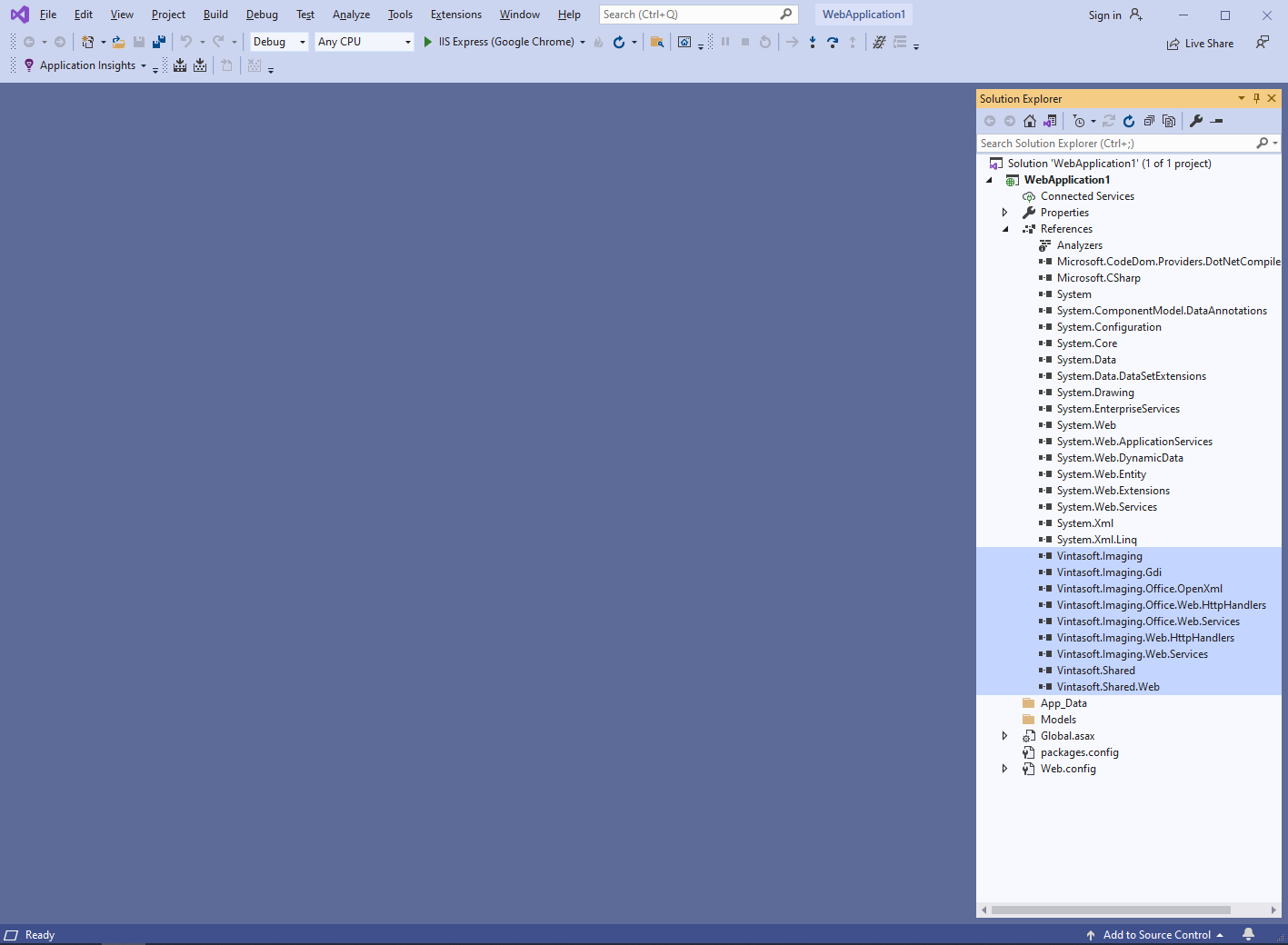 Добавьте ссылки на .NET-сборки Vintasoft.Shared.dll, Vintasoft.Imaging.dll, Vintasoft.Imaging.Office.OpenXml.dll, Vintasoft.Shared.Web.dll, Vintasoft.Imaging.Web.Services.dll, Vintasoft.Imaging.Office.Web.Services.dll, Vintasoft.Imaging.Web.Handlers.dll и Vintasoft.Imaging.Office.Web.Handlers.dll из папки "<SdkInstallPath>\VintaSoft Imaging .NET 15.0\Bin\DotNet4\AnyCPU\" в приложение ASP.NET WebForms.