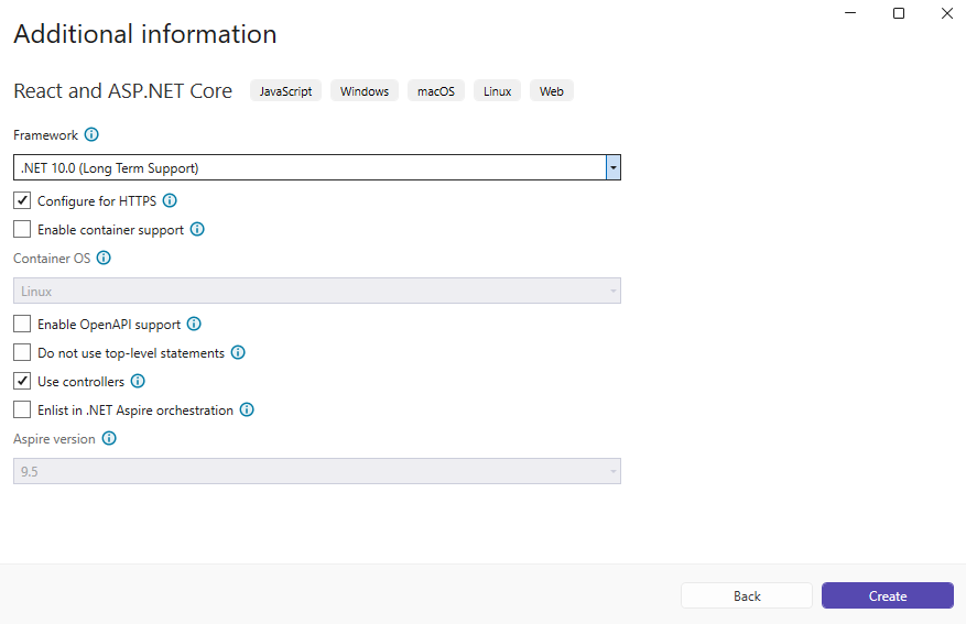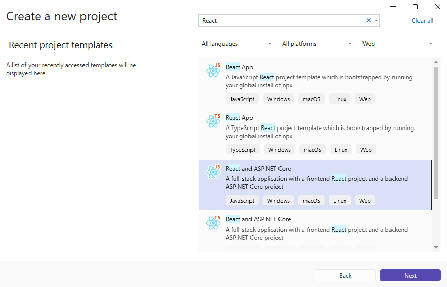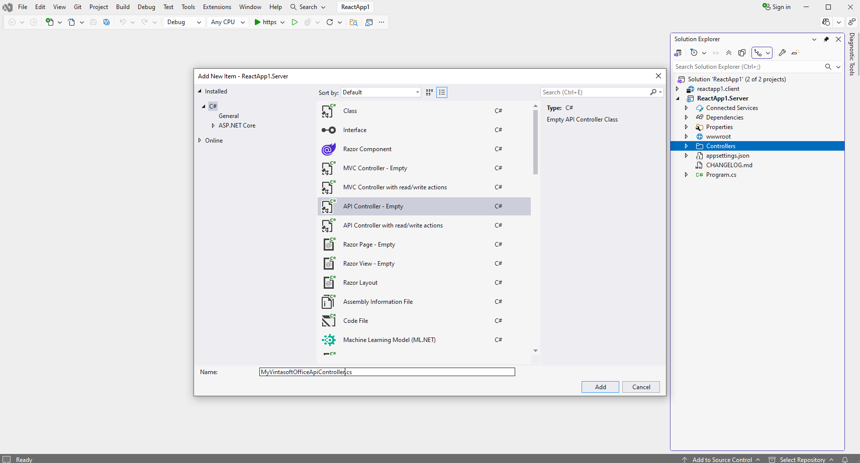 Откройте Visual Studio .NET 2026 и создайте новое приложение типа "React и ASP.NET Core":