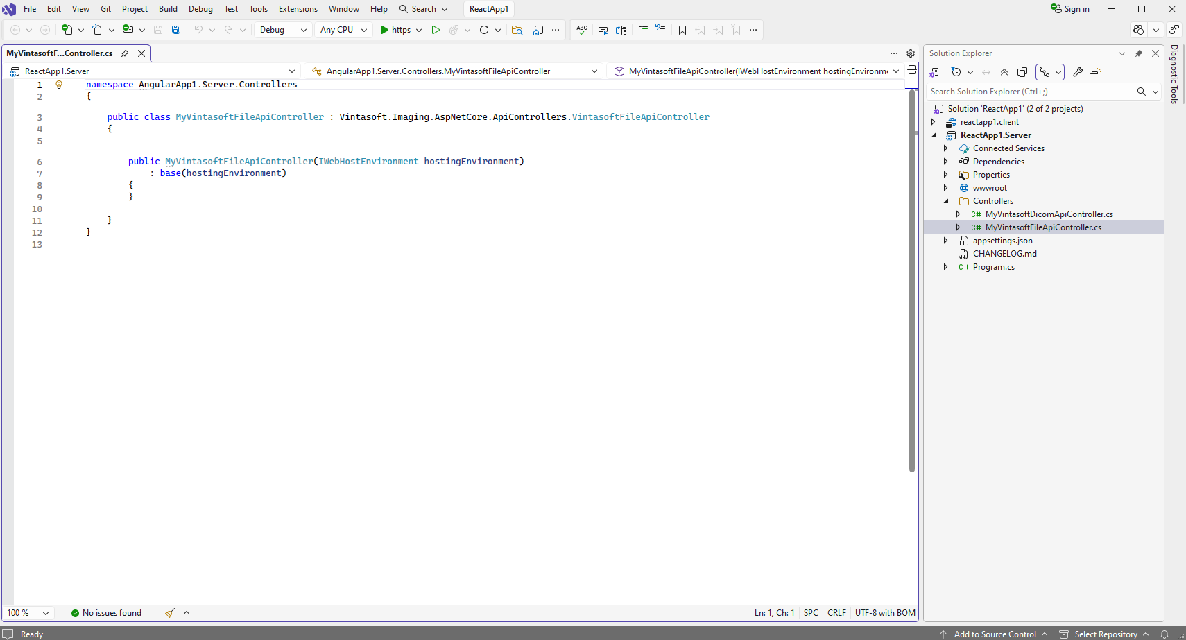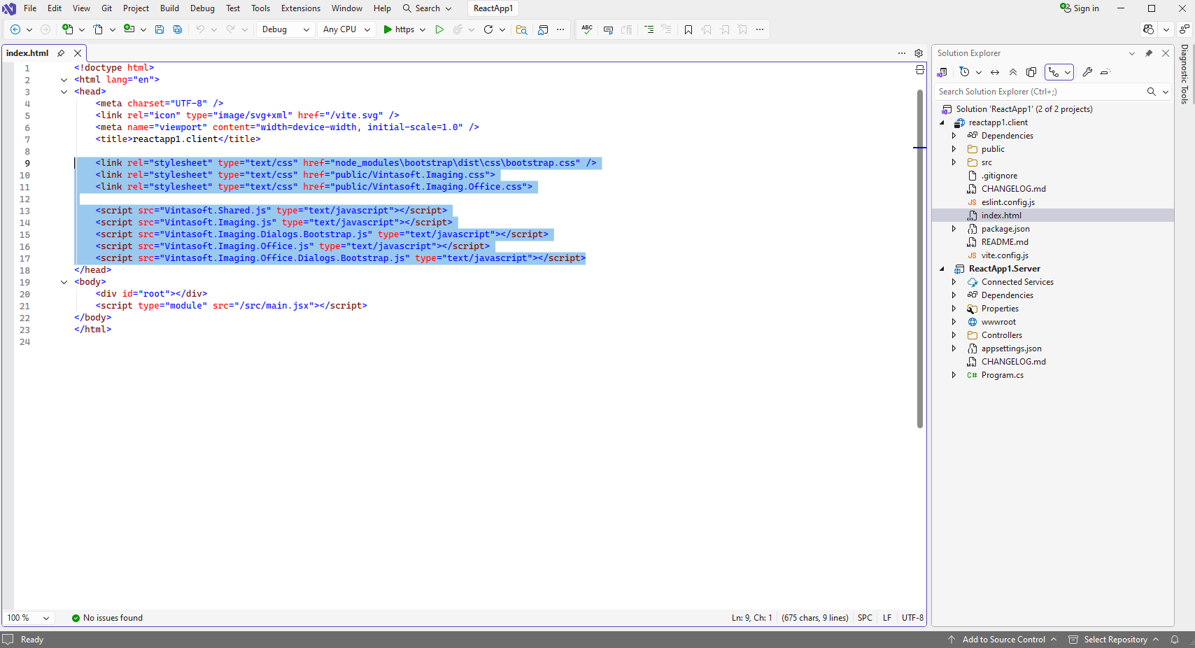 Откройте файл "vite.config.js" в проекте "reactapp1.client" и укажите, что приложение React.js может иметь доступ к контроллеру ASP.NET Core Web API "/vintasoft/api/" в проекте "ReactApp1.Server":