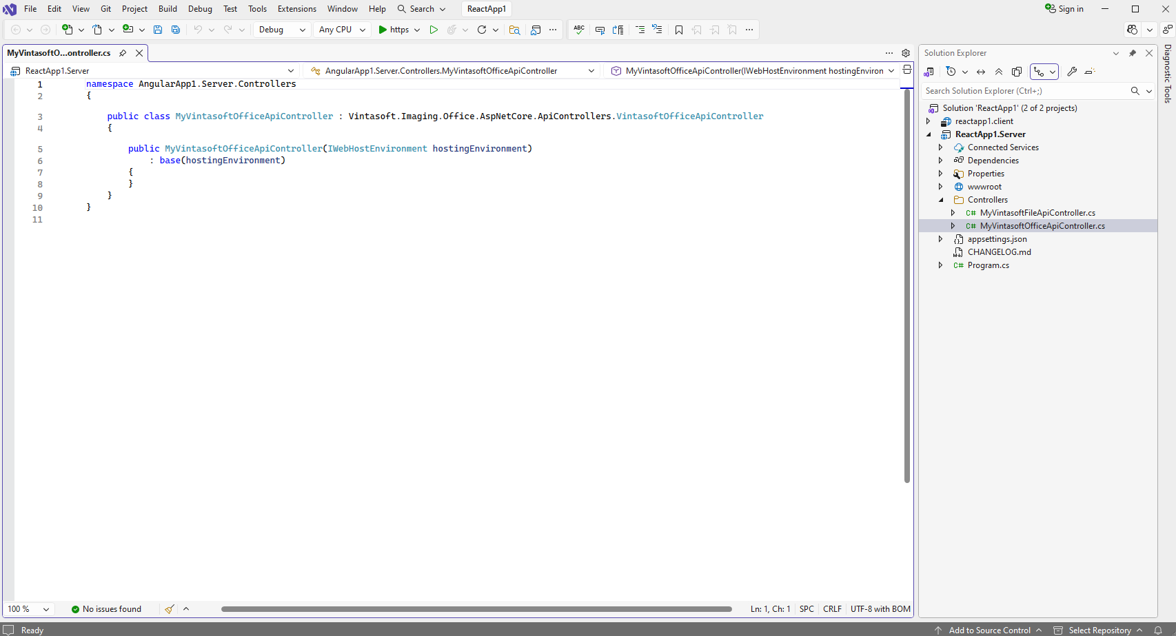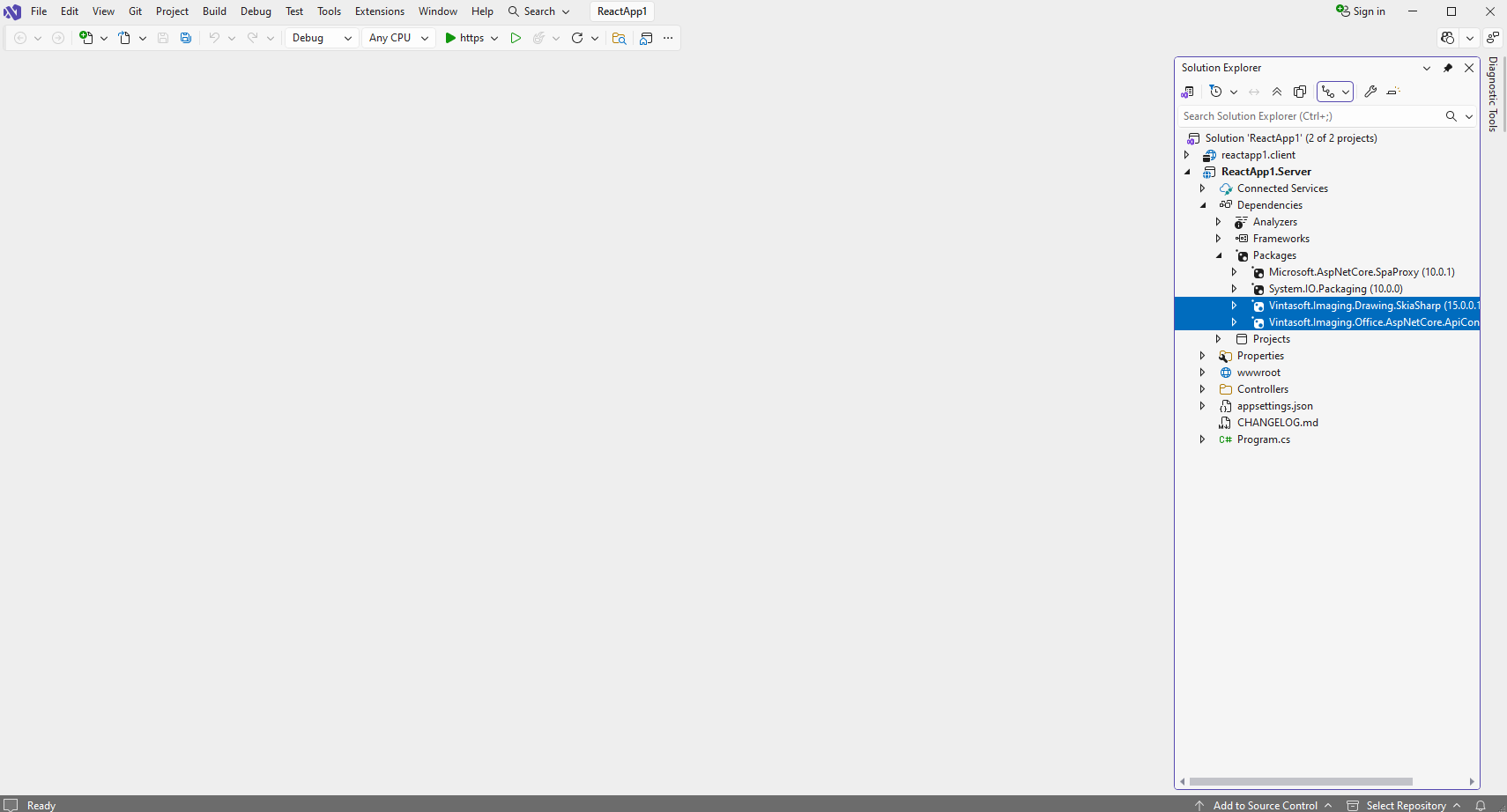Проект "ReactApp1.Server": Добавьте ссылки на nuget-пакеты Vintasoft в проект "ReactApp1.Server".