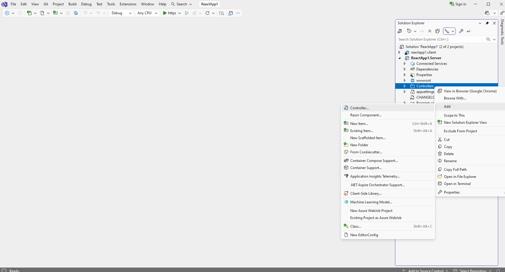 Создайте пустое приложение "React и ASP.NET Core" приложение.