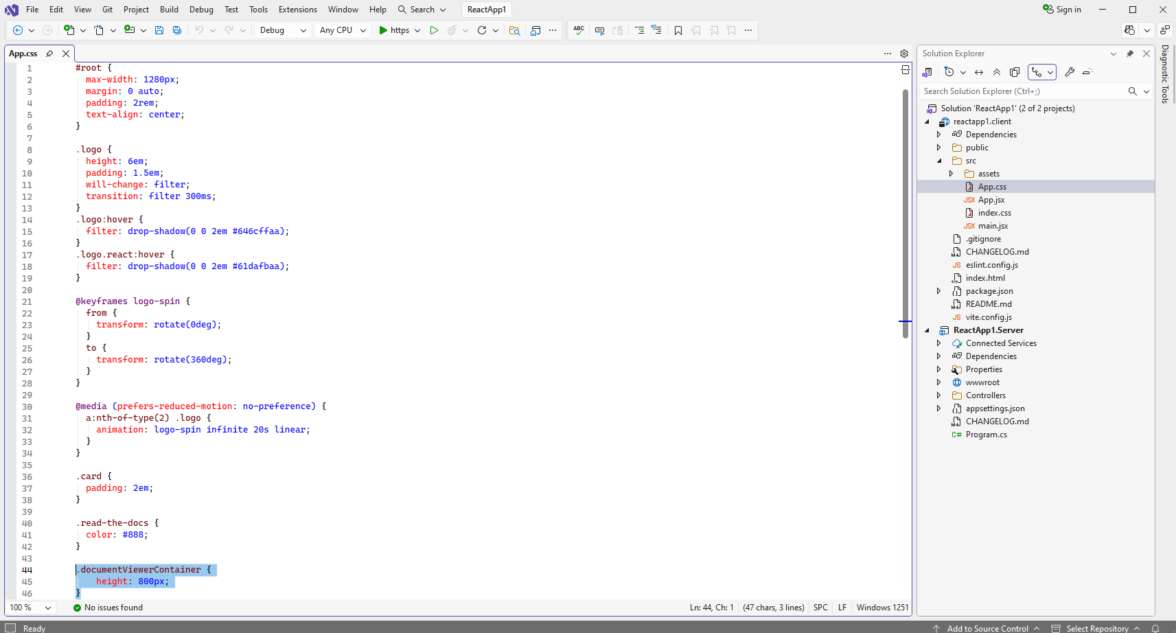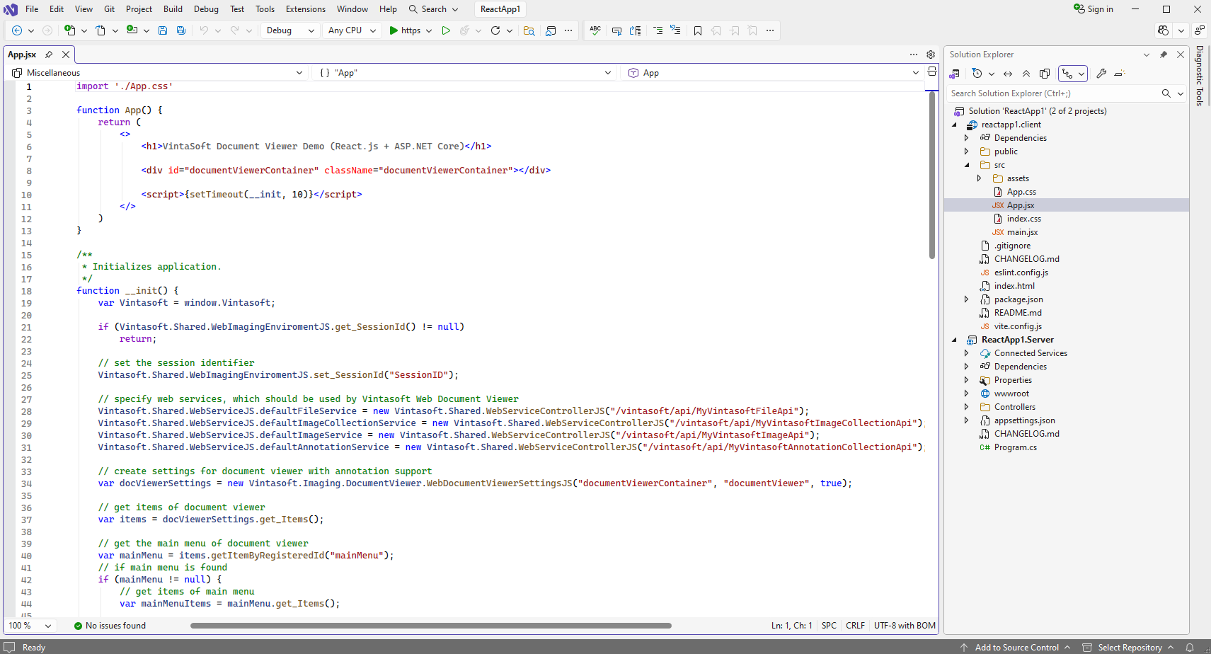 Откройте файл "src\App.jsx" в проекте "reactapp1.client", очистите файл, код функций "App" и "__init". Функция "App" возвращает HTML-разметку (заголовок страницы и DIV-элемент для веб просмотрщика документов). Функция "__init" инициализирует приложение и создает веб просмотрщик документов.