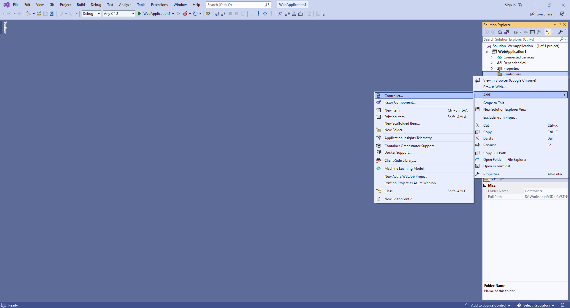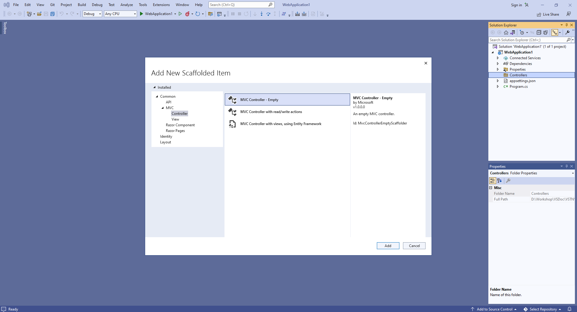 Правой кнопкой мыши нажмите на папку "Controllers" и выберите пункт "Add => Controller..." из контекстного меню