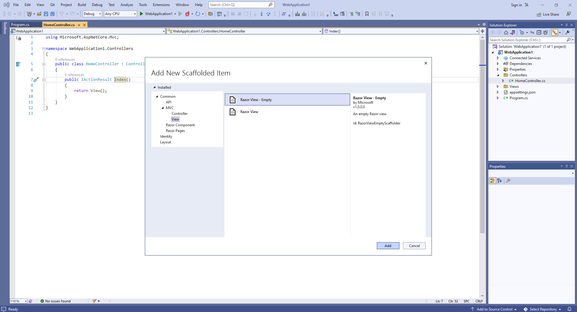 Выберите шаблон "Razor View - Empty", нажмите кнопку "Add", Установите вид в "Index" и нажмите кнопку "Add" => "Views\Home\Index.cshtml" файл будет создан