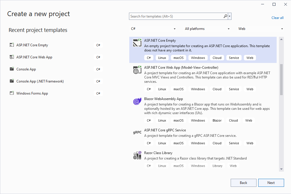 Откройте Visual Studio .NET 2022 и создайте новый проект приложения типа ASP.NET Core Web:
