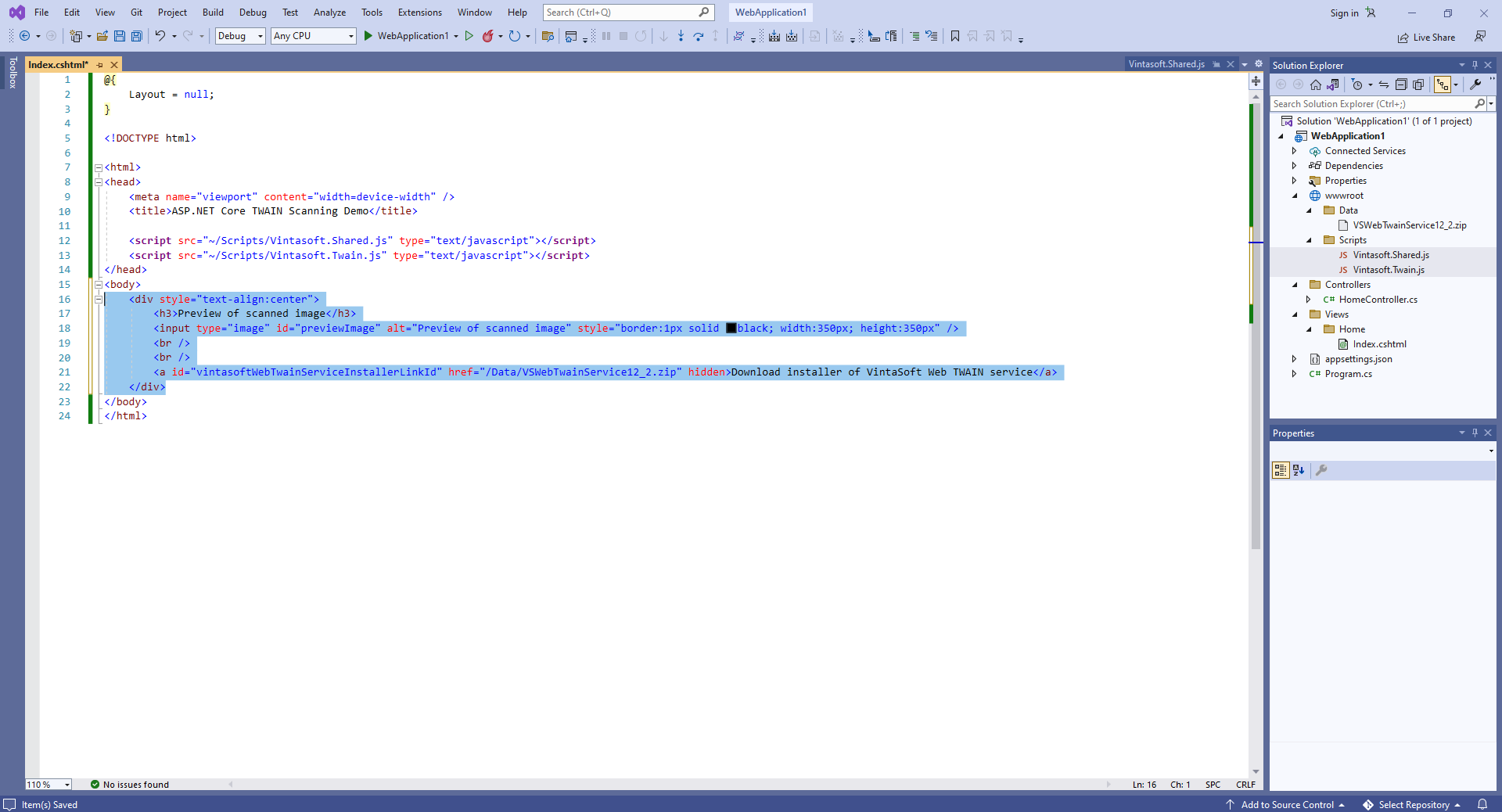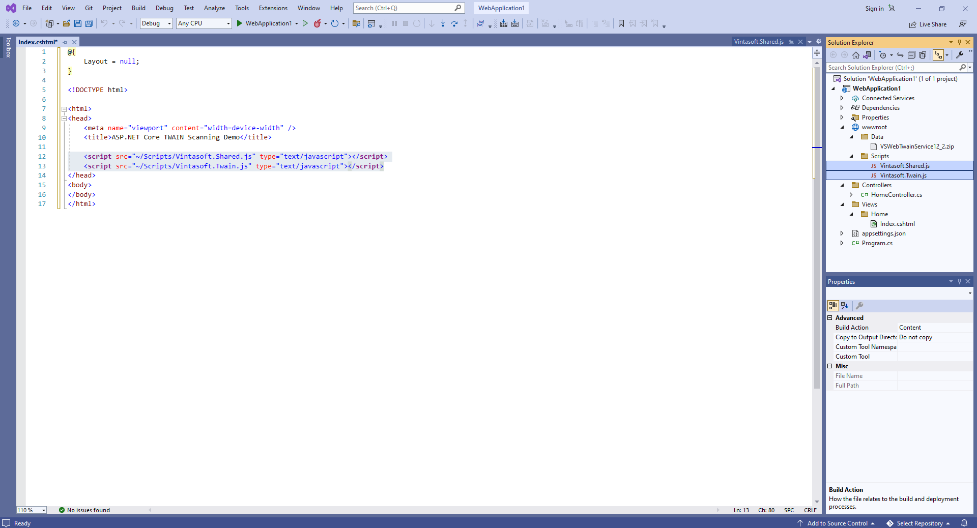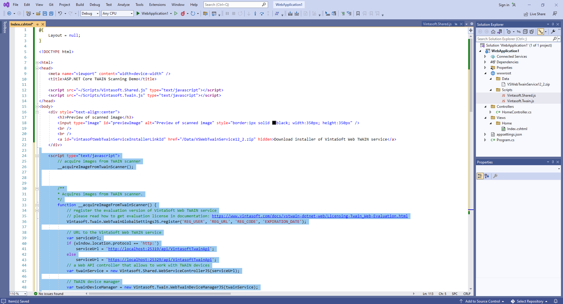 Откройте файл "Views\Home\Index.cshtml" и добавьте ссылки на Vintasoft JavaScript файлы на странице с кодом: