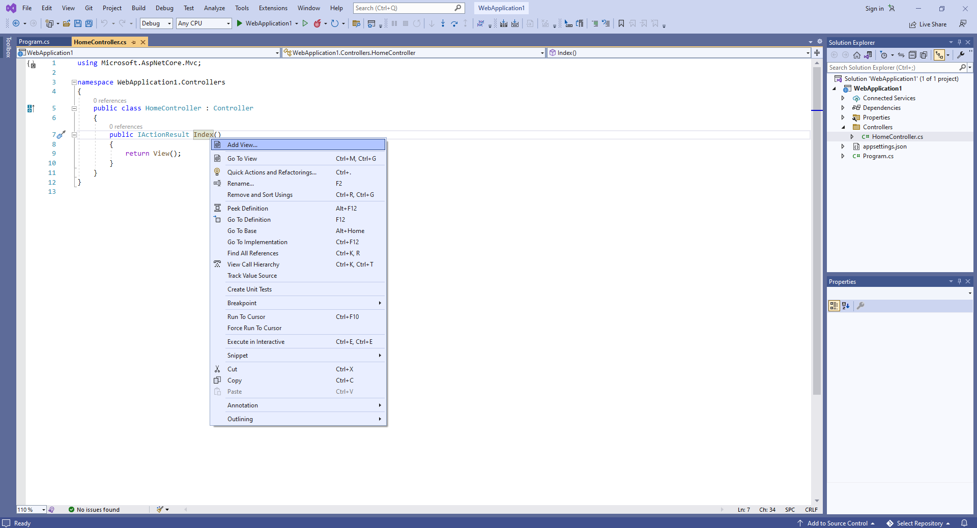 Откройте файл "HomeController.cs", правой кнопкой мыши нажмите на метод "Index" класса DefaultController и выберите пункт "Add View..." из контекстного меню