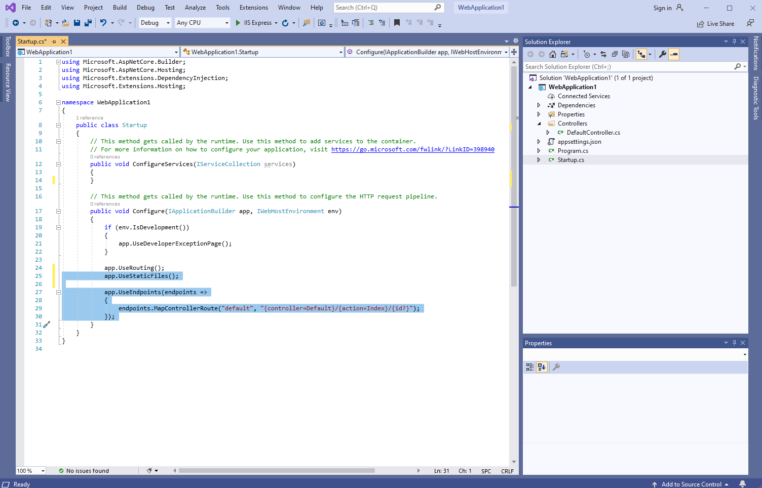 Вот исходные C# коды файла Startup.cs: